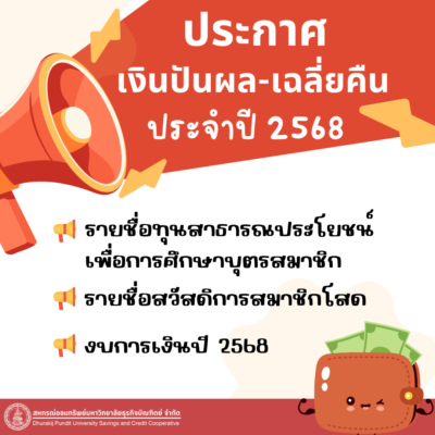 ประกาศเงินปันผล-เฉลี่ยคืน ทุนสาธารณประโยชน์ เพื่อการศึกษาบุตร สวัสดิการคนโสด และงบการเงิน ประจำปี 2568