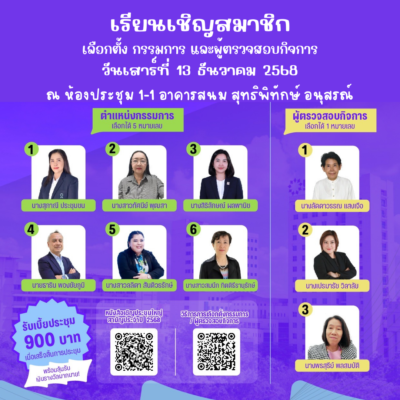 ขอเรียนเชิญสมาชิกเข้าร่วมประชุมใหญ่สามัญประจำปี 2568 พร้อมเลือกตั้งกรรมการและผู้ตรวจสอบกิจการ