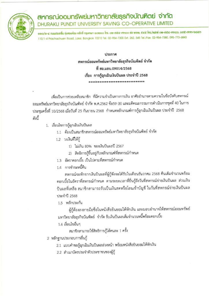 เพื่อเป็นการช่วยเหลือสมาชิก ที่มีความจำเป็นทางด้านการเงิน สหกรณ์ออมทรัพย์ มธบ. จำกัด  เปิดให้สมาชิกที่มีความจำเป็น เข้าร่วมโครงการกู้ฉุกเฉินเงินปันผลล่วงหน้าปี 2568 โดยกำหนดหลักเกณฑ์ในการกู้ฉุกเฉินเงินปันผล ประจำปี 2568 ดังนี้