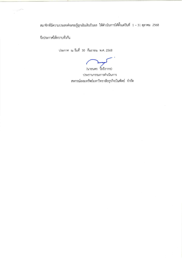 หมายเหตุ : สมาชิกที่มีความประสงค์จะขอกู้ ให้ดำเนินการได้ตั้งแต่วันที่ 1 – 31 ตุลาคม 2568